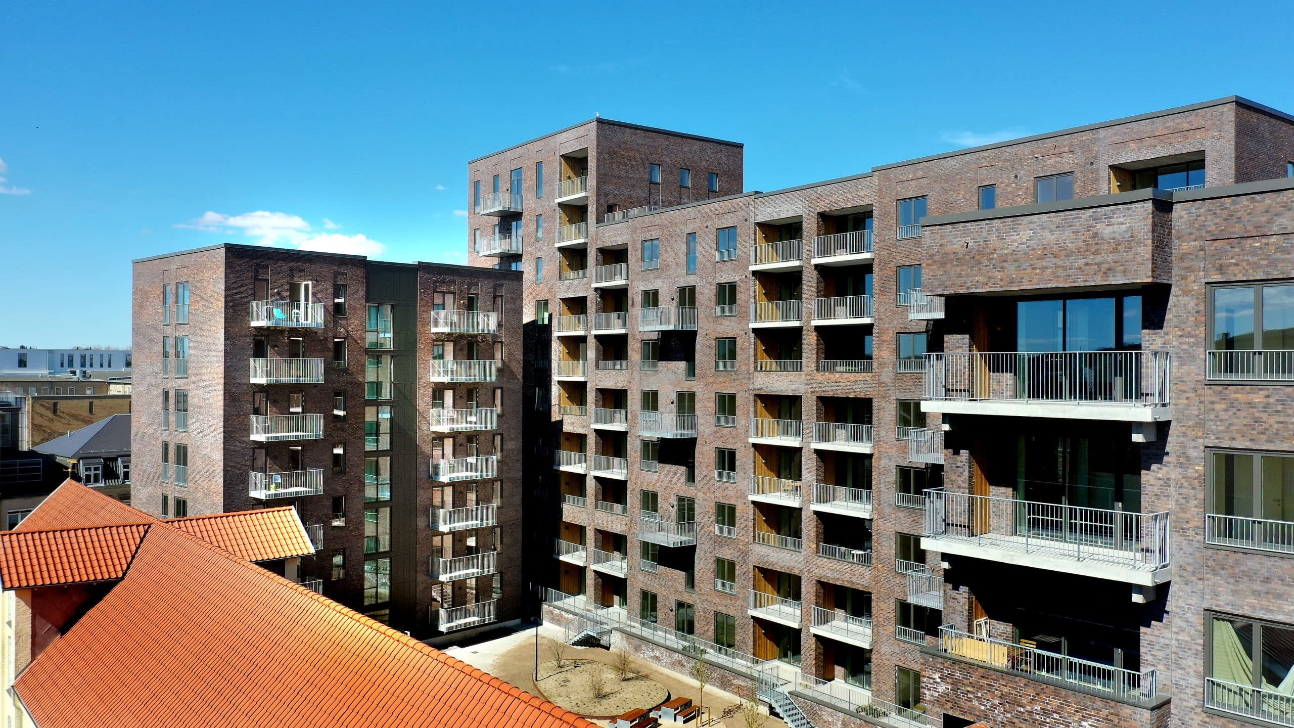 I det grønne område mellem bygningerne findes et hyggeligt gårdmiljø med masser af dagslys. I stedet for en klassisk karréstruktur, hvor fire længer skaber skygge, er AstaHus nemlig designet til at lukke lyset ind.